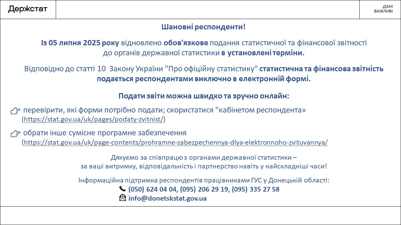 З 5 листопада 2025 року працює новий ПОРТАЛ ОФІЦІЙНОЇ СТАТИСТИКИ (stat.gov.ua). Сайт Держстату (ukrstat.gov.ua) не оновлюється.